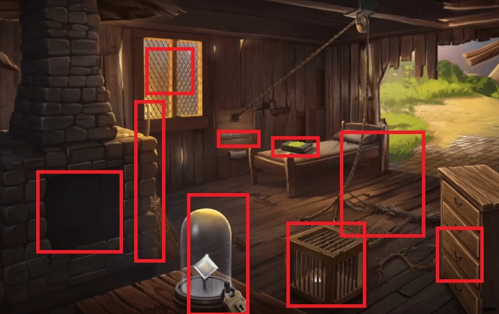 - Go back to the room, use a matchbox to burn the cage into the fireplace.