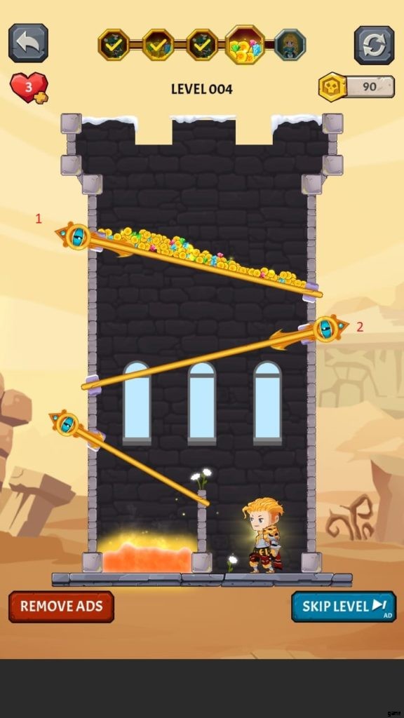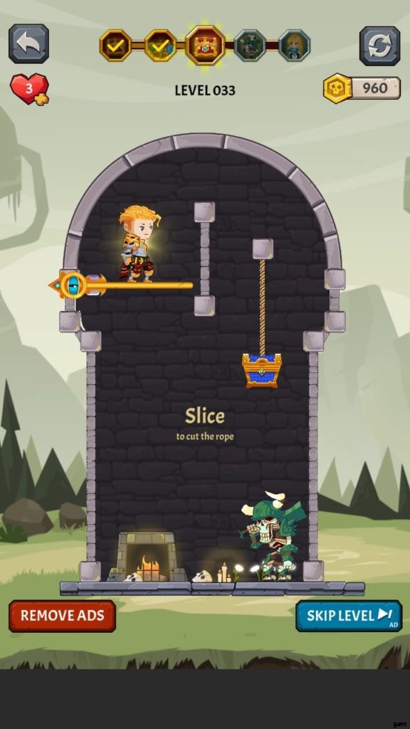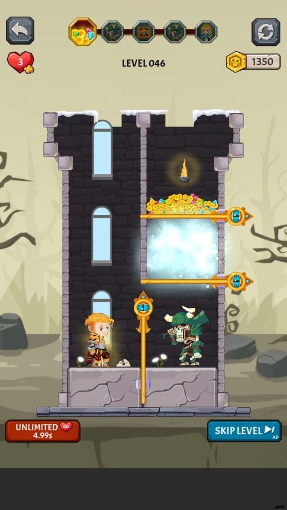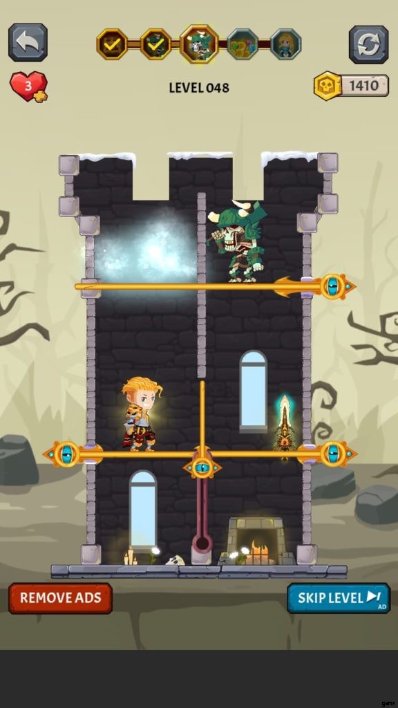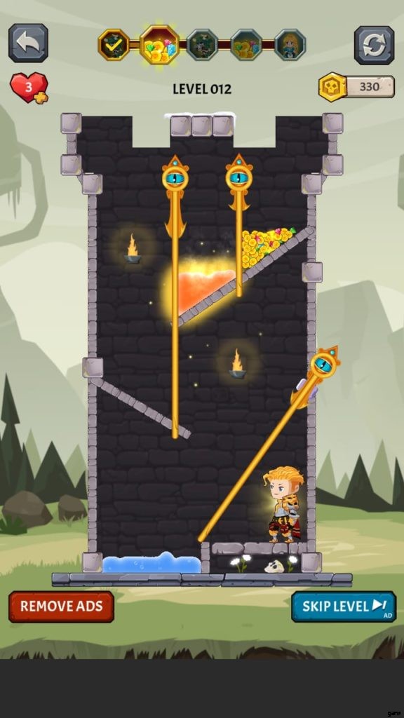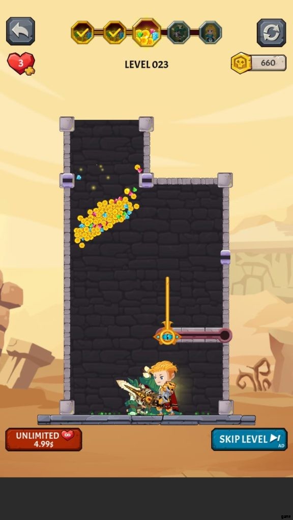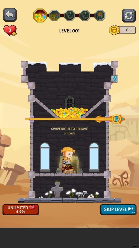 ヒーローを選択すると、ゲームは最初のレベルに落ちます。ここでは、モンスターがいないときに宝のピンを取り除かなければなりません。お試しレベルです。黄金のコインのピンを外して落とします。ピンを削除するには、スワイプまたはタッチする必要があります。広告を見ると、最初のレベルを完了した後に獲得したコインが 2 倍になる場合があります。