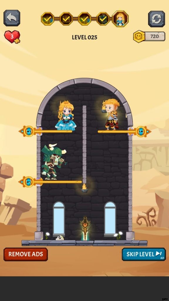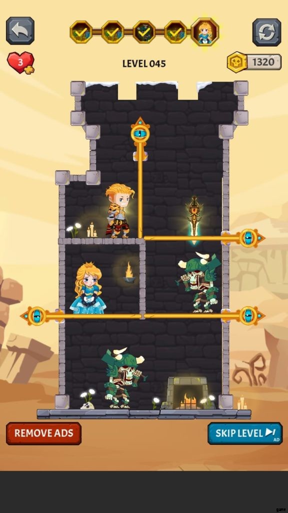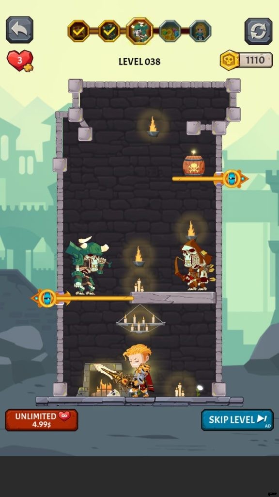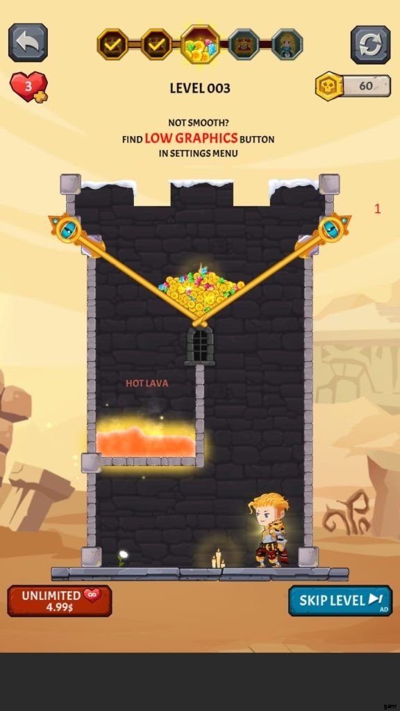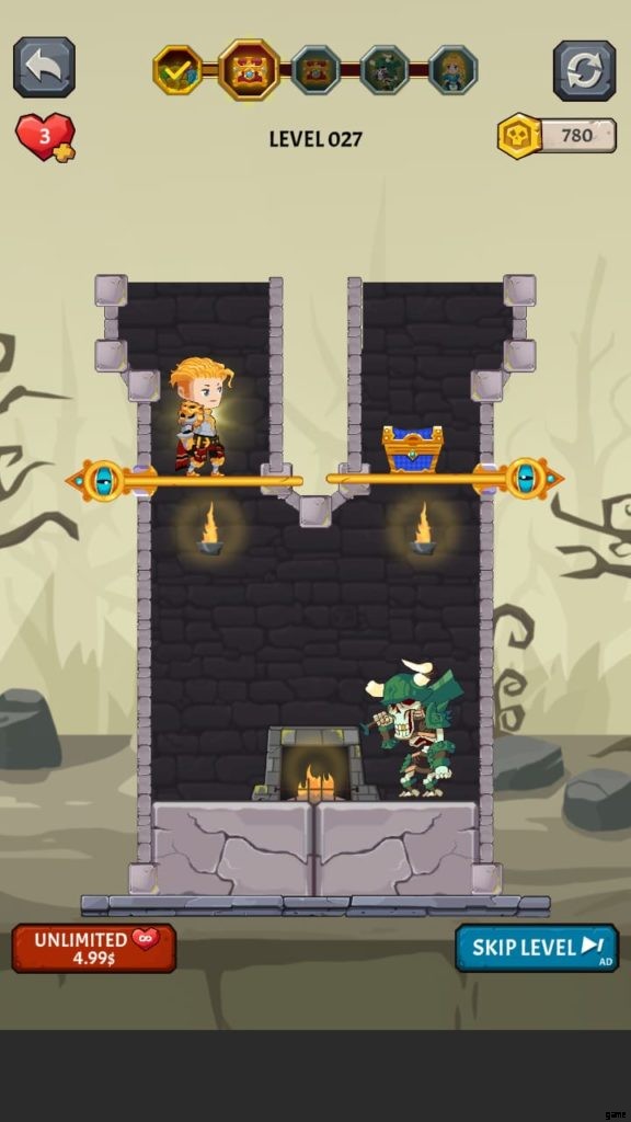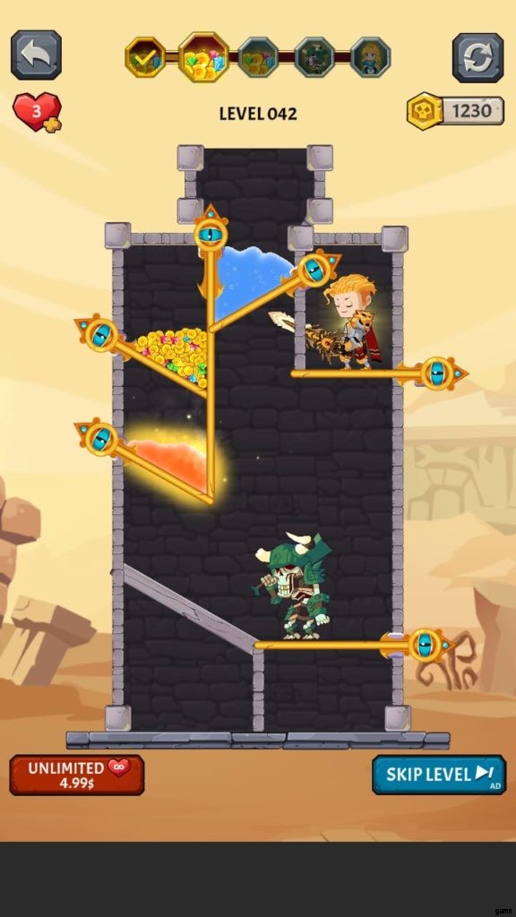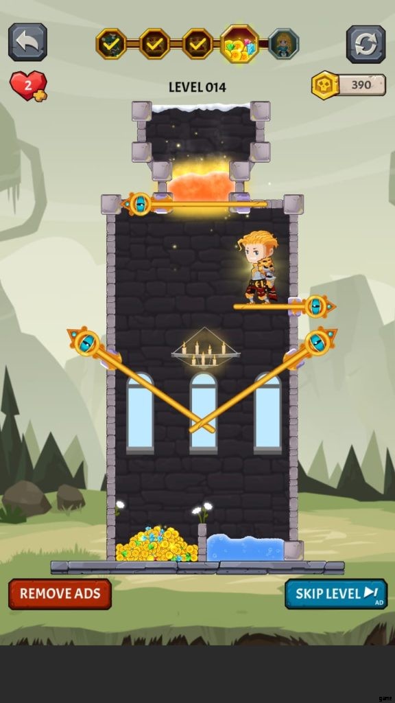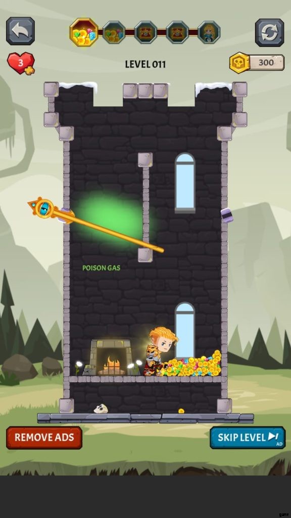 ヒーローを選択すると、ゲームは最初のレベルに落ちます。ここでは、モンスターがいないときに宝のピンを取り除かなければなりません。お試しレベルです。黄金のコインのピンを外して落とします。ピンを削除するには、スワイプまたはタッチする必要があります。広告を見ると、最初のレベルを完了した後に獲得したコインが 2 倍になる場合があります。