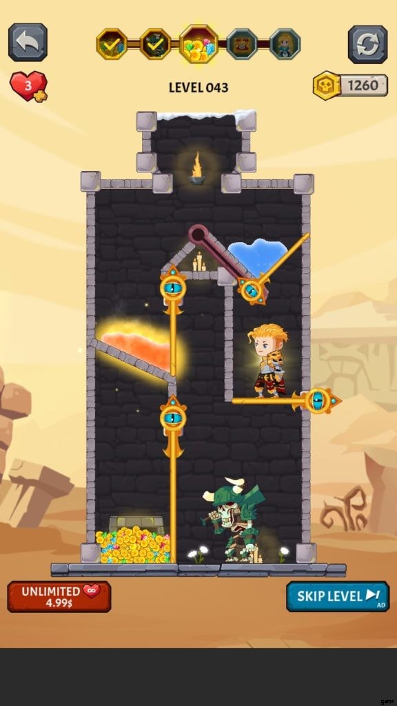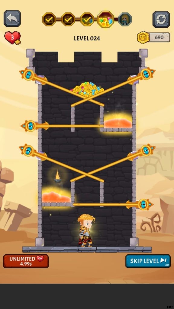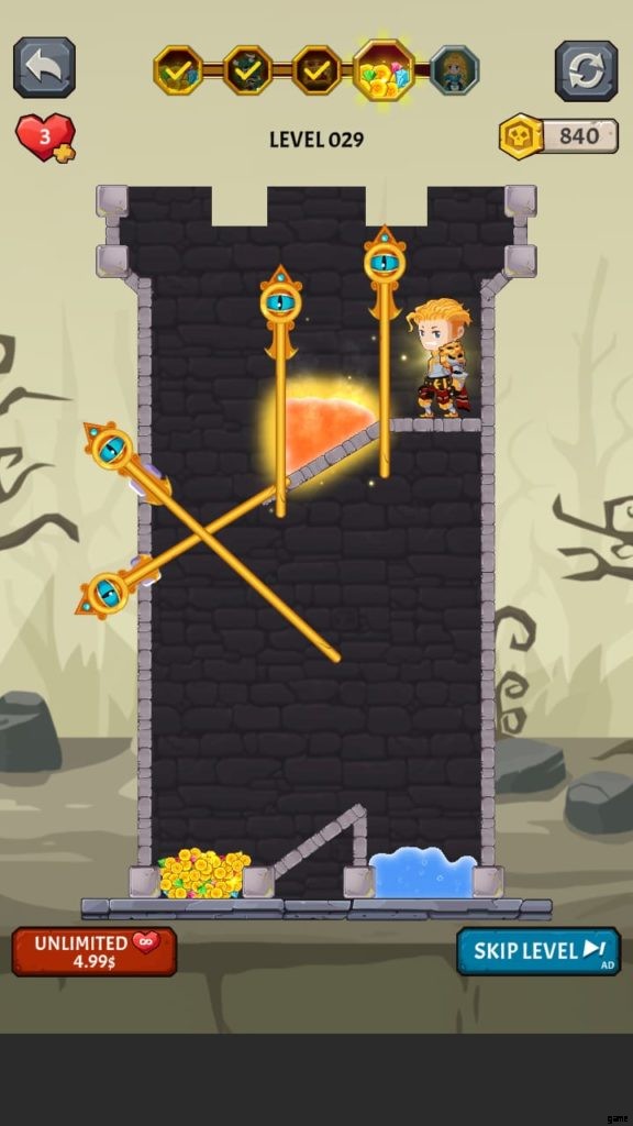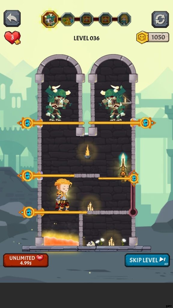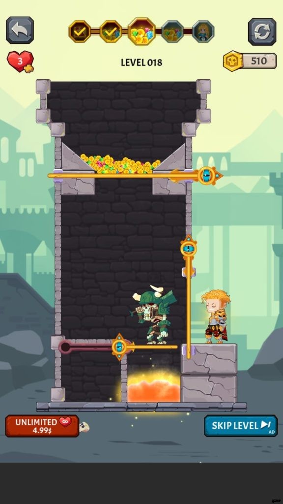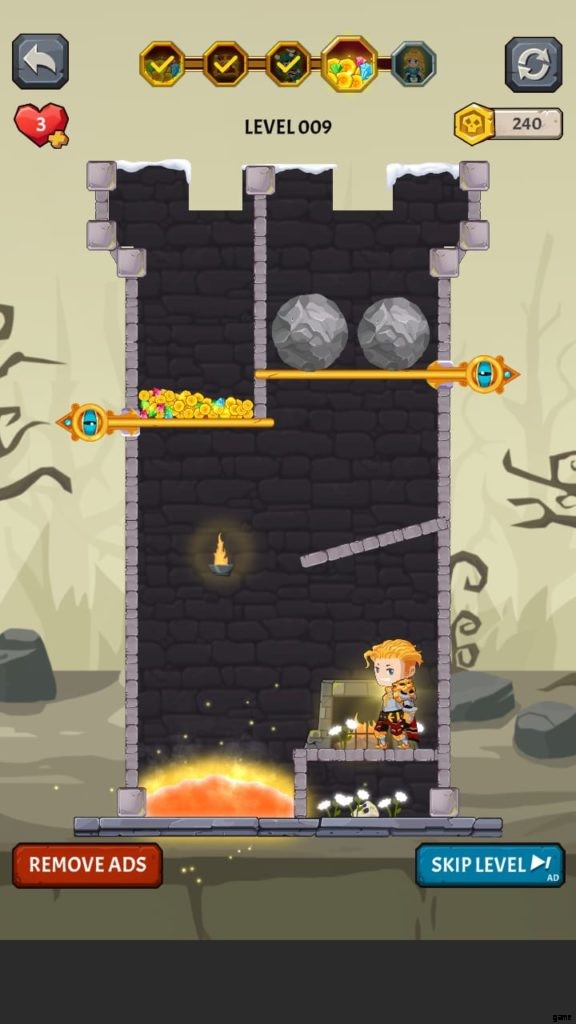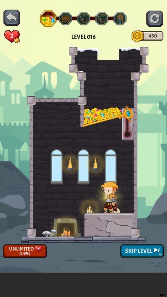 How to Loot (ビデオ ゲーム) には多くの美しい世界があります。それぞれに独自の背景と、モンスターやその他の課題が潜んでいる塔が付属しています。第 4 段階では、溶岩の上に固定されたピンをタップしないようにしながら、宝のピンをスワイプしてから下のピンをスワイプして騎士を助ける必要があります。それを行うと、すべての宝物が無駄になり、多くの人がレベルを終了します.