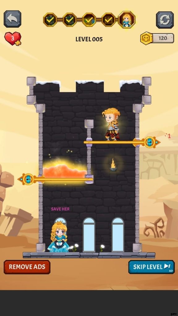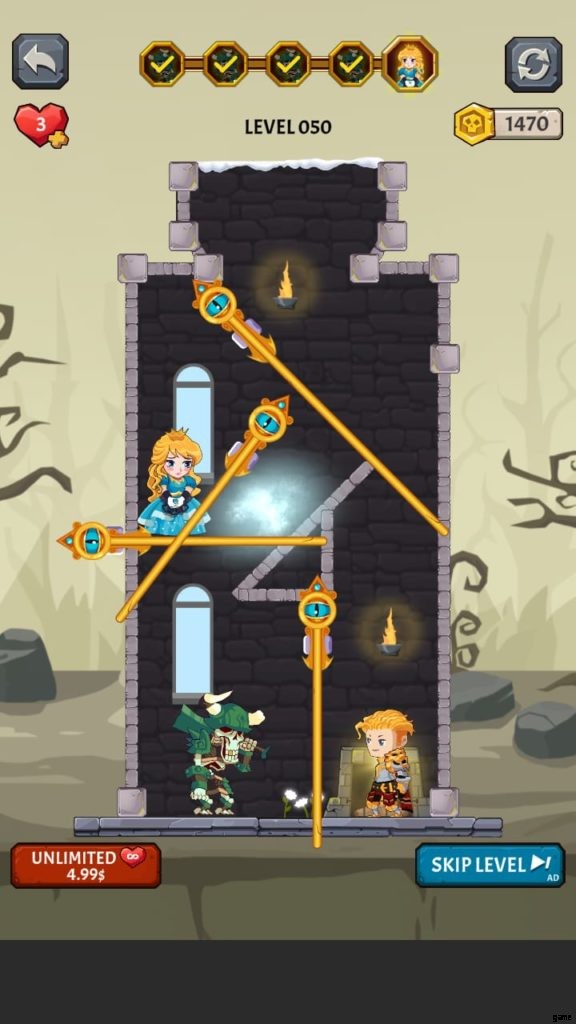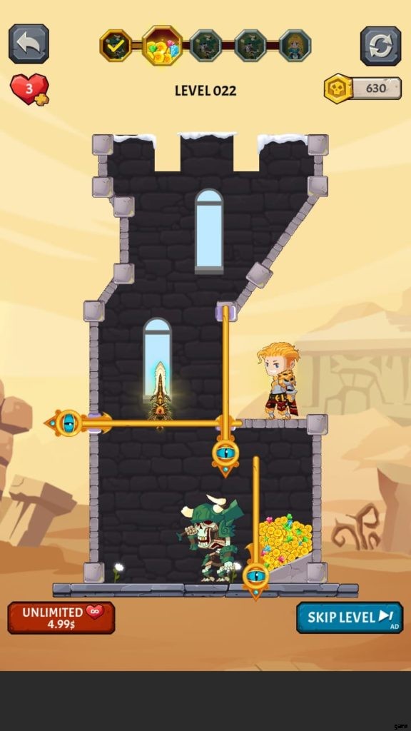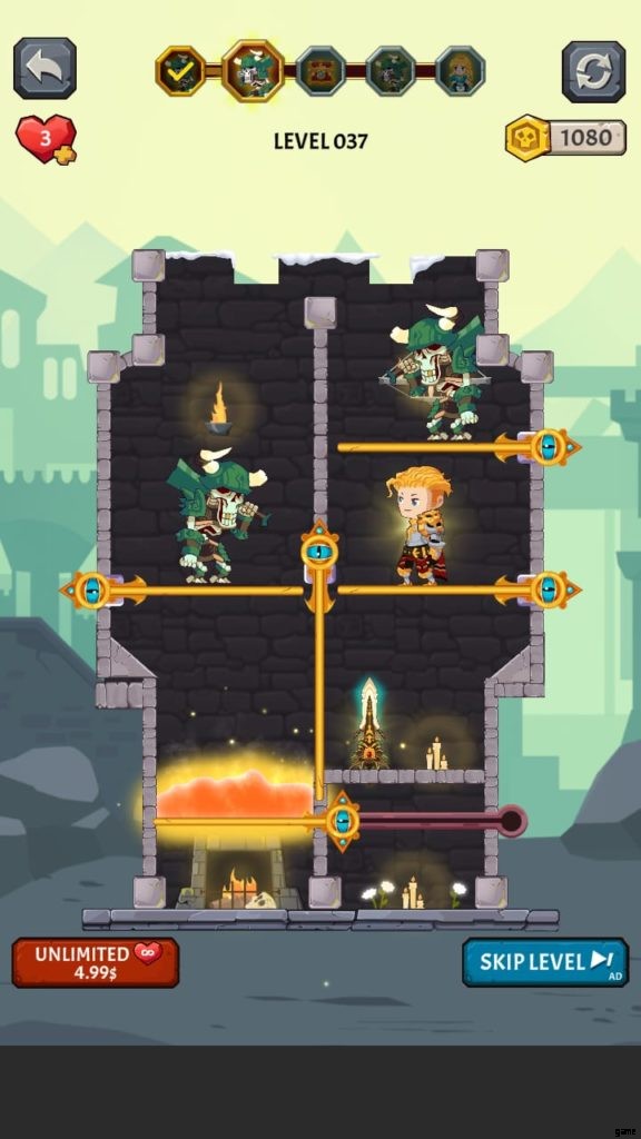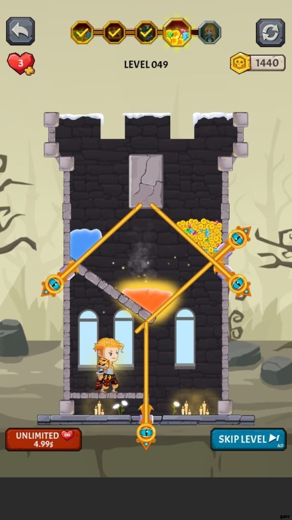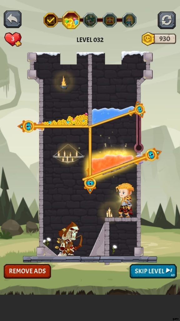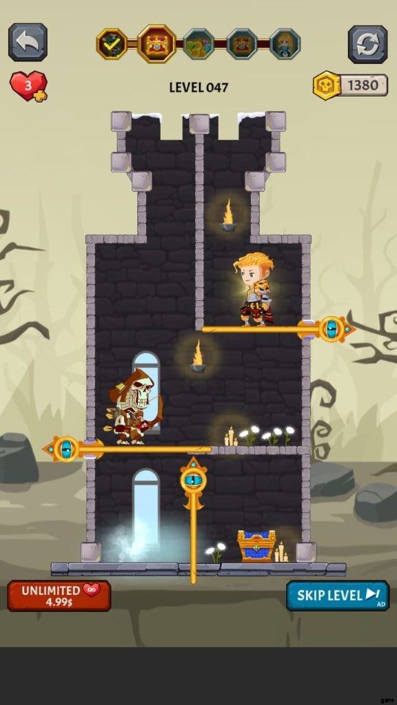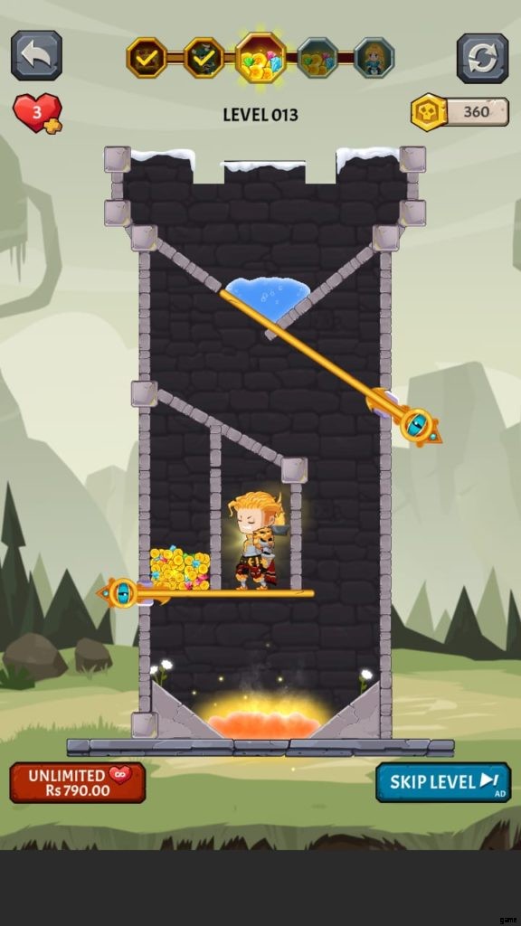 How to Loot (ビデオ ゲーム) には多くの美しい世界があります。それぞれに独自の背景と、モンスターやその他の課題が潜んでいる塔が付属しています。第 4 段階では、溶岩の上に固定されたピンをタップしないようにしながら、宝のピンをスワイプしてから下のピンをスワイプして騎士を助ける必要があります。それを行うと、すべての宝物が無駄になり、多くの人がレベルを終了します.