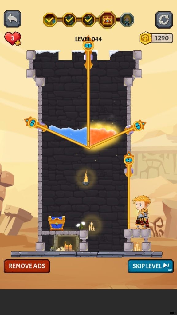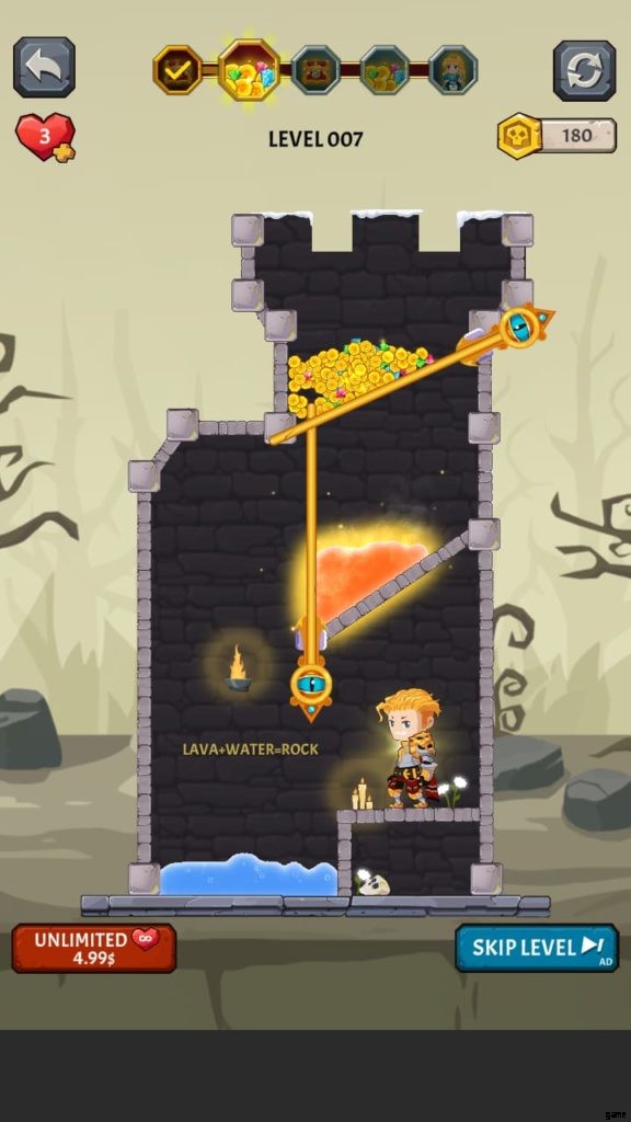 他のレベルよりも数回の追加タップが必要な、最もトリッキーなレベルかもしれません。このゲームでは、2 つの異なる場所に溶岩があり、溶岩の流れを止めるためのハードルが作成されます。 2 階にある溶岩を 1 階に持ってきて、水を放出して冷やすことをお勧めします。完了したら、宝物を解放してキャラクターを収集させます。