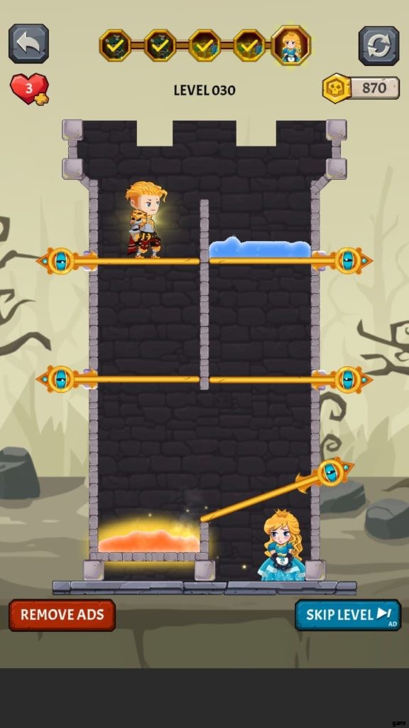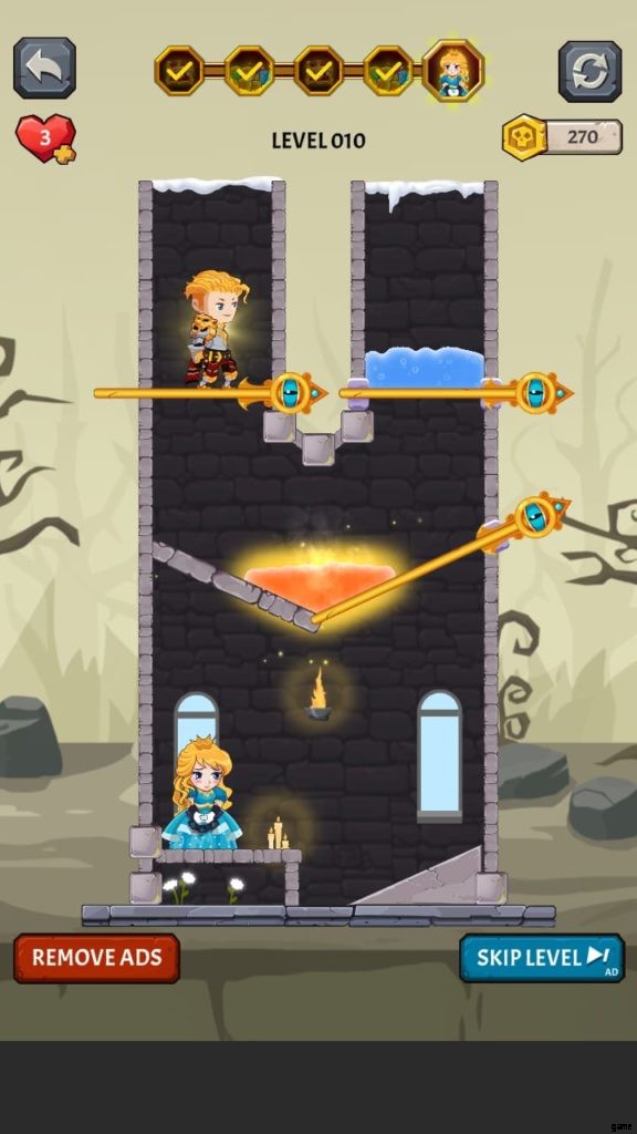 ゲームの上部には水があり、下部には熱い溶岩があり、その間に立っています。水と溶岩の両方を冷却して脱出する方法を見つけてください。解決策は非常に簡単です。水を放出して溶岩を冷やしてから、水平ピンを取り外して騎士と宝物の両方を解放します。