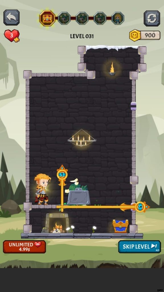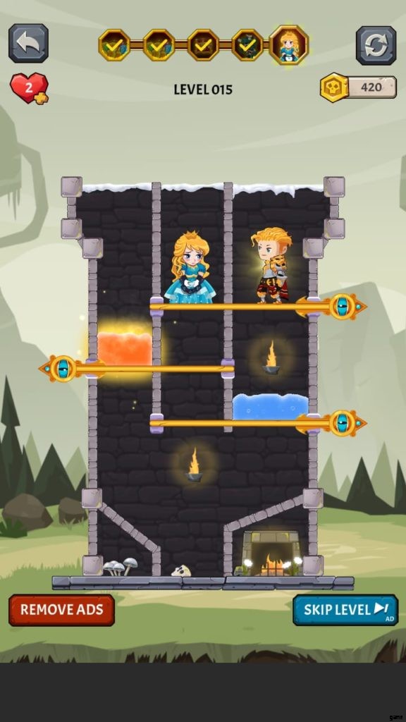 2 レベルでは、ゲームはピンの数を 2 に増やします。各レベルには、収集が最初の目的である宝物があります。そこにはたくさんのトリッキーな冒険が待っています。宝のピンを外し、宝の下に固定されている 2 ピンに戻します。