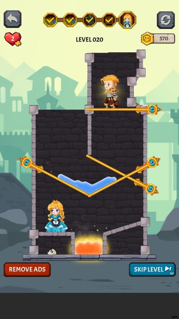 レベル 20 は他のレベルよりも少しトリッキーです。したがって、さらなるレベルのロックを解除するには、すべてのパズルとなぞなぞに対処する必要があります。パズルを作るために、ゲームにはいくつかの追加のピンが含まれており、スワイプして宝物にたどり着く必要があります。レベルは、鉄の鎖を使って王女を保持します.
