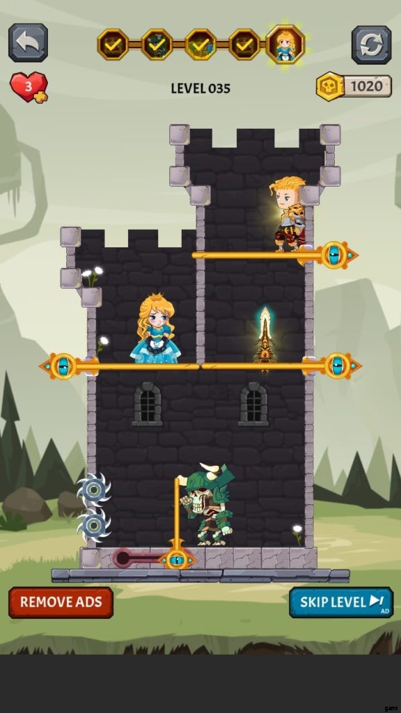 1階ではトゲが回転するモンスターが待ち構えています。騎士の下からピンを外し、モンスターに対して使用する剣を持たせます。王女を解放する代わりに、騎士を一歩下に連れて行き、騎士とモンスターの間の戦いを組織する必要があります。完了したら、プリンセスを解放して脱出してください。