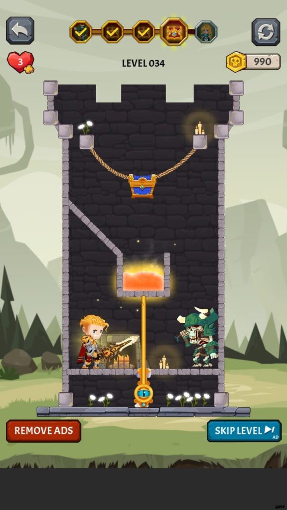 悪質なモンスターがレベルの真ん中であなたを待っています。彼はまた、宝物を守り、誰にもコインを盗ませませんでした。モンスターの真下で、ゲームは燃える溶岩を特徴としています。溶岩とモンスターの両方を同時に退治する方法を見つけなければなりません。ピンを左方向にドラッグしてモンスターを溶岩に落とし、ピンを元の位置に戻します。宝物を解放し、キャラクターがそれを収集するのを止めているピンを取り外します。