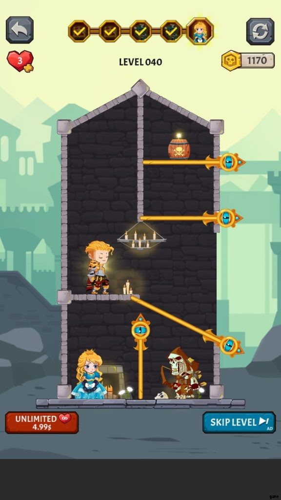 - その後、残りのピンをスワイプして、王女を倒した後、騎士に助けてもらいます。