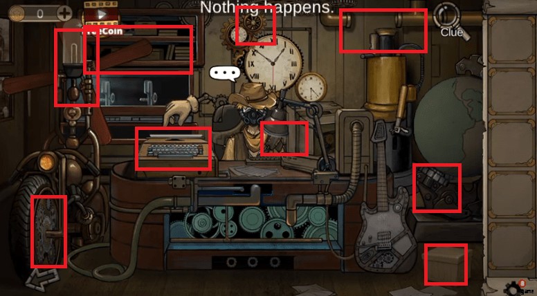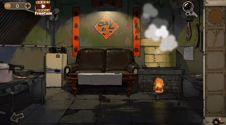 部屋 005 に到達し、男性の後ろにある時計をクリックします。時間を 5:05:45 に設定します 箱を開けて ギア 3 を発見 .その後、部屋 004 に移動し、テーブルから火のトングを収集する必要があります。さらなる手順については、ウォークスルーに従ってください: