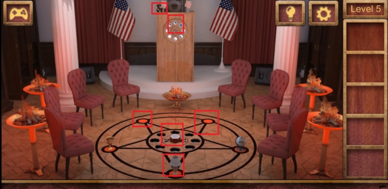5 番目のレベルでは、マイク付きの机があり、2 つのアメリカ国旗に囲まれたステージを探索できます。