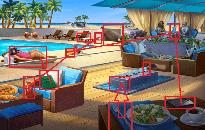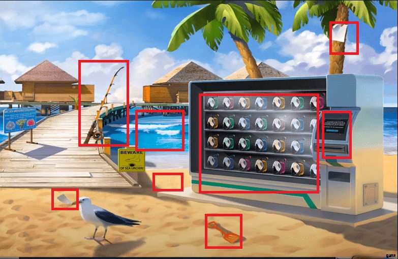 ドアのロックを解除すると、シュノーケル棚の前に立っています。ここで隠しオブジェクトを見つける必要があります;その間、トリッキーなパズルを解くのに苦労しています 犯人を見つけるために . チュートリアルに記載されている手順に従ってください of アドベンチャー エスケープ ミステリー:パラダイス ミステリー – 第 6 章 .