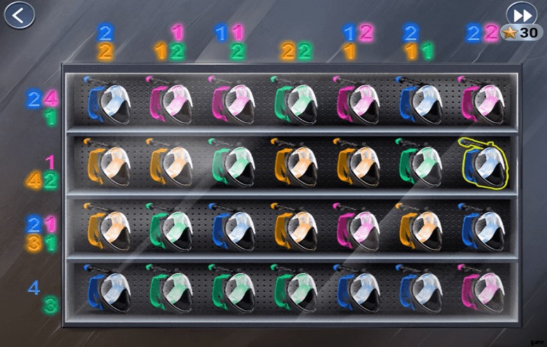 - ゲームはミニゲームを開始します ここで、数字は、各列または行に各色のマスクがいくつあるべきかを示しています。ただし、2 つのマスクをタップすると、位置が入れ替わる場合があります。
