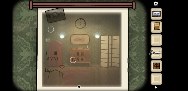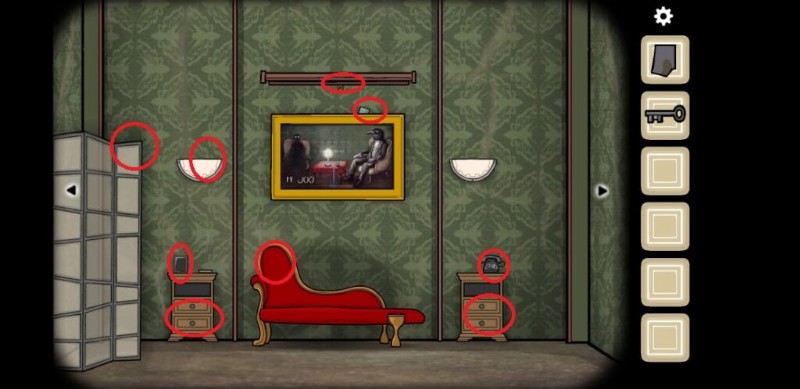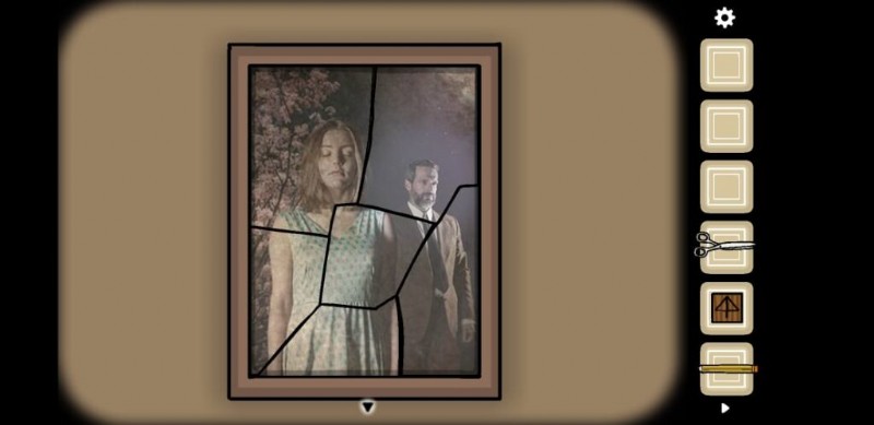 写真の欠落部分をすべて集めたら、赤いソファがある部屋に戻る必要があります。ソファの左側にはワードローブがあり、タップすると空のフォトフレームが表示されます。持ち物からすべてのピースを使って写真を完成させてください。