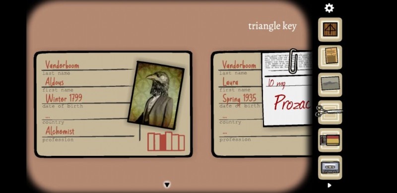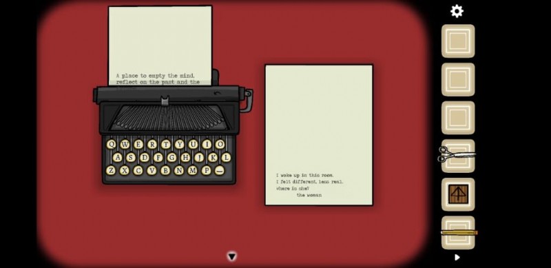 右側の次の部屋には、タイプライターがあります。それに向かい、絵「女性」の後ろにある言葉を入力してください。入力後、タップすると鉛筆を使用して色を塗りつぶすタスクが割り当てられるプリントが表示されます。完了すると、2 番目の印刷物に、何としてでも逃げなければならないメイン ドアのイメージが表示されますが、今のところ、ドアは閉じられています。ドアがいっぱいになるように絵を描き、次の質問とともに 3 番目の画像が出てくるようにします:なぜ私は彼女のことを考え続けるのか ? 私はこの女性に会ったことがありません 、また別の殺人事件だった .