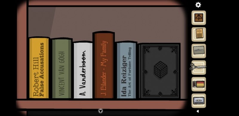 Vanderboom に関する情報と、ハンカチやスライド 2 などのアイテムを収集したら、TV ラウンジに戻ります。 .テレビの近くに食器棚があり、そこにある本棚をクリックして位置を設定する必要があります。次の順序でブックを設定する必要があります: