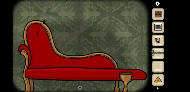 テレビラウンジを出て、ソファと昔ながらの電話が置かれた部屋へ。ソファをクリックして紐を集めます はさみを使う .