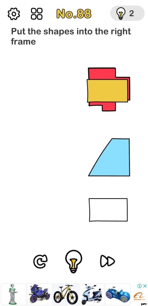 Brain Out レベル 88 それぞれ3つの幾何学的形状とその図が付属しています。あなたの目標は、図形を適切なフレームに配置して、次のシーンのロックを解除することです.
