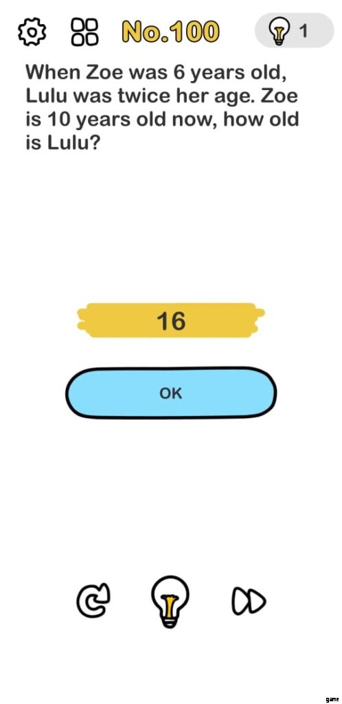 Brain Out レベル 100 では、画面に論理的な質問が表示されます。質問への答えは、次のレベルのロックを解除します。ルルが彼女の2倍の年齢だったとき、ゾーイは6歳でした。つまり、ルルは12歳でした.ゾーイが 10 歳になると、ルルは 16 歳になります。