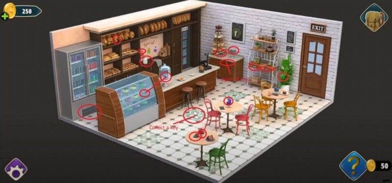 ルームズ アンド エグジット ブックストアを脱出した後、あなたはベーカリーにいることに気づきました。そこには、食べられないが問題を解決するために使用できるお菓子がたくさんあります。 Rooms and Exits 6th Level を完了する方法を学ぶためのヘルプ ガイドは次のとおりです。 .