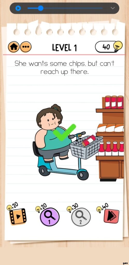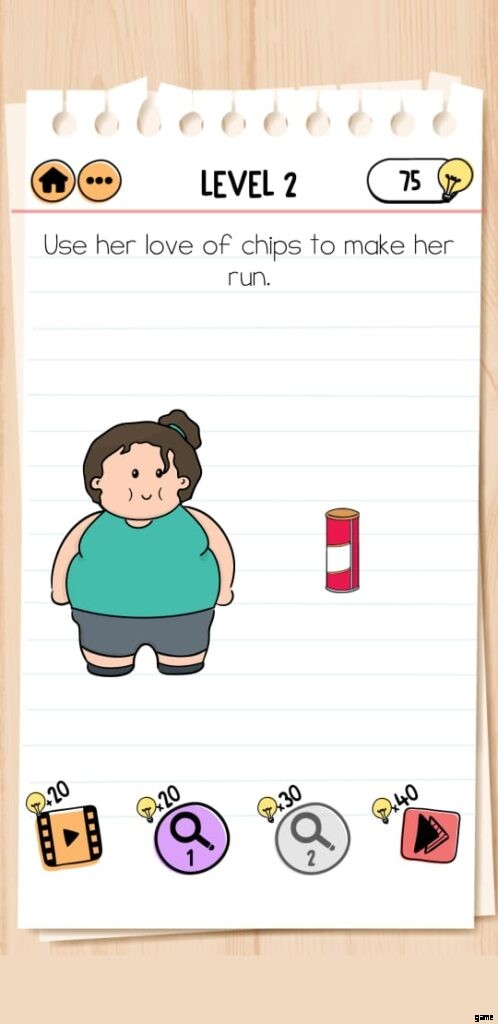 シンディはお腹が空いたのでポテトチップスを食べたいと思っていますが、体重のためにそれができません。 Brain Test 2 レベル 1 では、解決策を見つけるだけで Cindy を助けなければなりません。