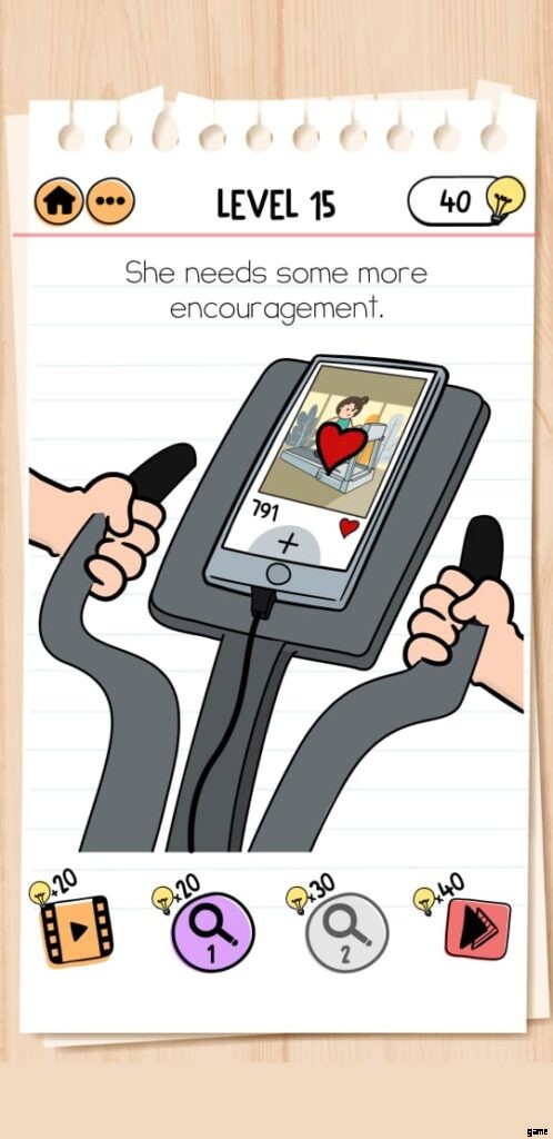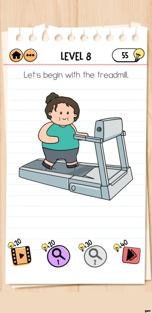Brain Test 2 – Fitness with Cindy レベル 8 には、トレッドミルが付属しています。シンディがトレッドミルを使って運動するのを助ける任務を負っています.