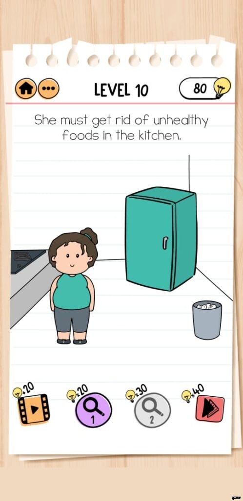 Brain Test 2 – Cindy and Fitness レベル 10 は、Cindy が不健康な食べ物を取り除くことを計画しているキッチンで行われ、彼女はあなたの助けを必要としています.このレベルでは、不健康な食べ物を見つけて捨てる必要があります。