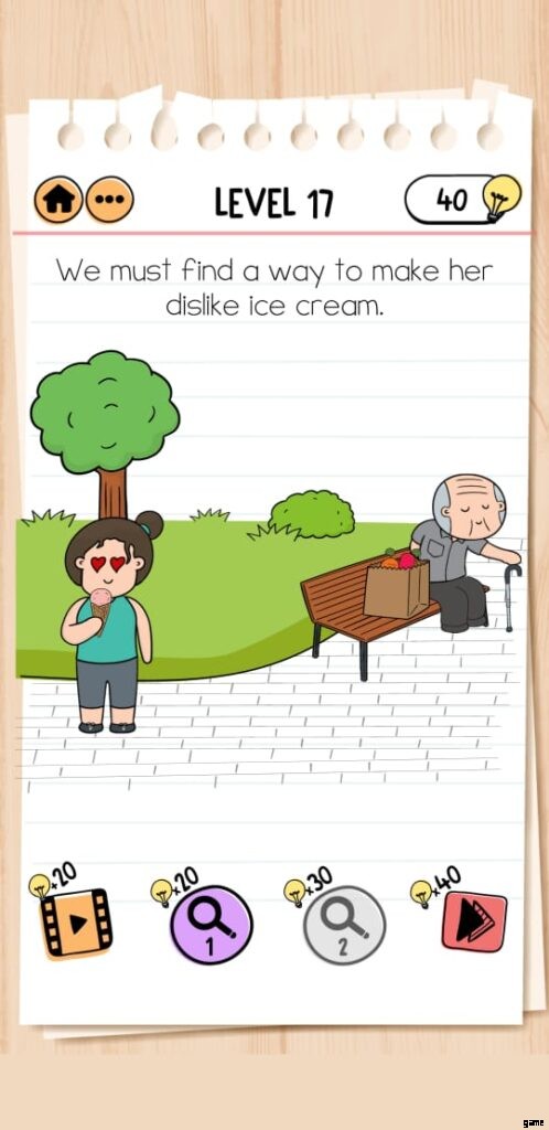 - 解決策: ベンチに座っている老人の買い物袋をドラッグします。次に、小さなボールをアイスクリームにドラッグして入れ、アイスクリームの味をシンディにとって最悪の味にします。