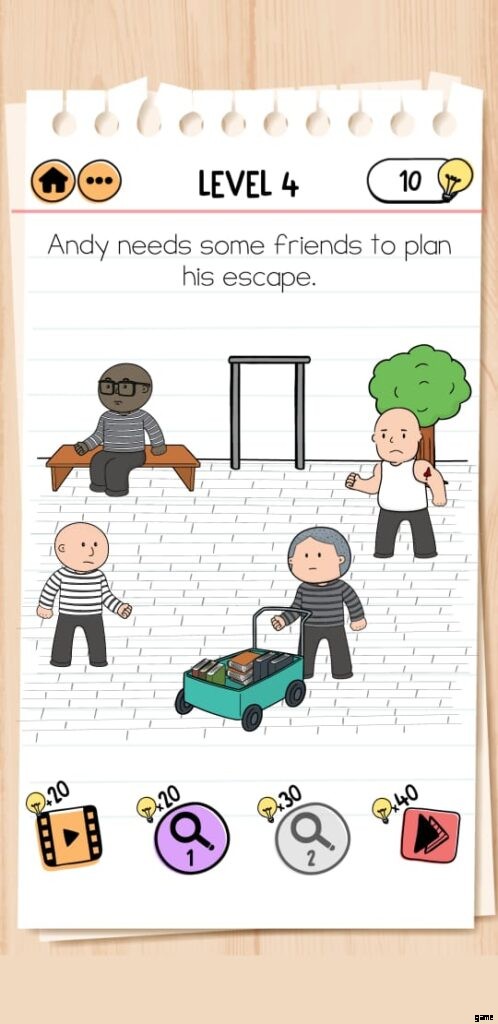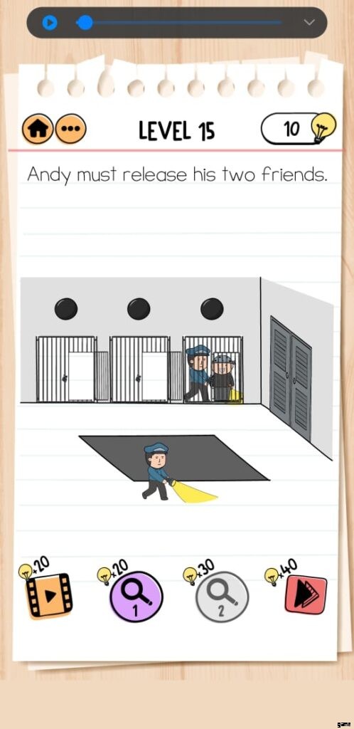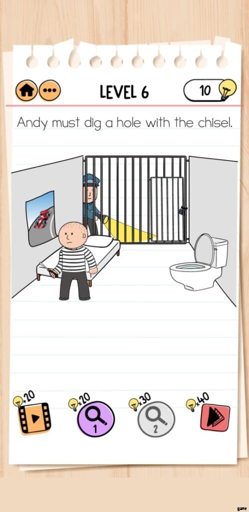 Brain Test 2 Prison Escape Level 6 では、アンディが前のレベルで盗んだノミを使って穴を掘るのを手伝わなければなりません。しかし、警察官がアンディを監視しているため、仕事は一見簡単ではありません。そのため、掘る際には注意が必要です。
