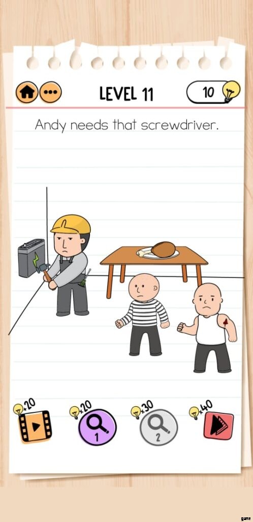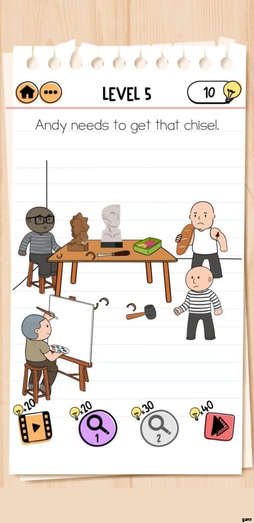 友達を作った後、アンディはノミが必要で、それを手に入れるためにあなたを探しています。あなたは、他の 2 人の友人と一緒に Chisel を入手する計画がある部屋にいます。 Brain Test Prison Escape レベル 5 を完了するには、以下の手順に従う必要があります: