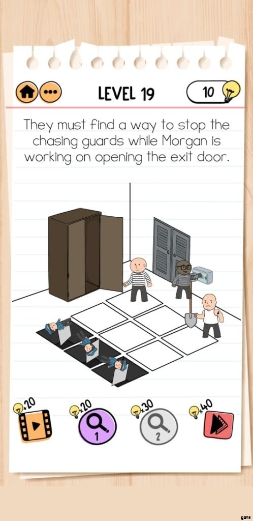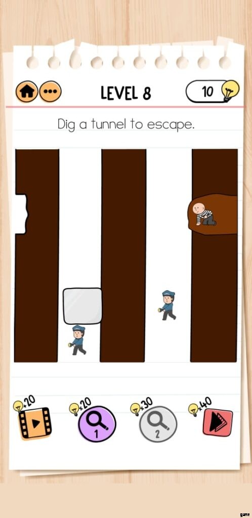 ツールを隠した後、ゲームはトンネルを掘る任務を負っており、2 人の警察官が急いであなたを捕まえようとしています。 Brain Test 2 Prison Escape Level 8 を完了するには、両方の警官があなたから離れているときにトンネルを掘る必要があります。