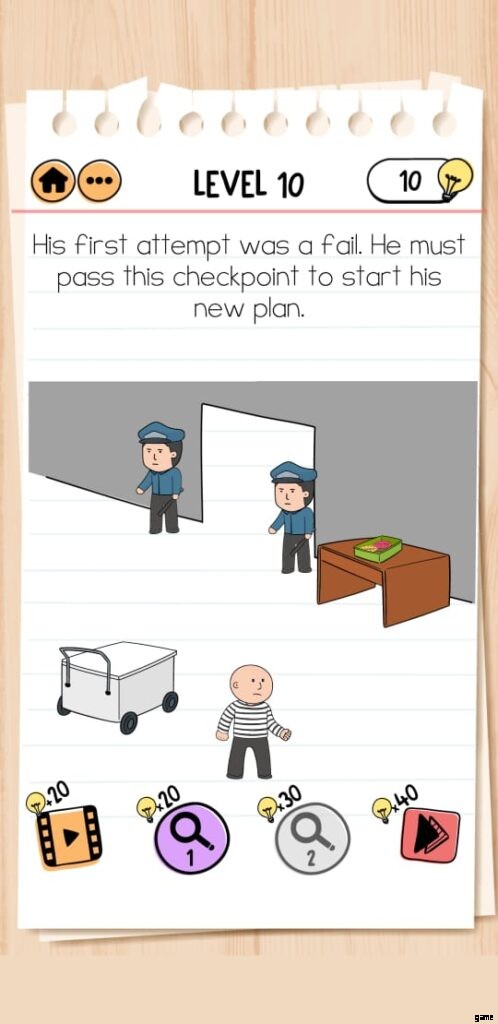 レベル 10 には、アンディが通過しなければならないチェックポイントがあります。誰も通過させないように、検問所には2人の警官が任命されています。したがって、既成概念にとらわれずに解決策を見つける必要があります。
