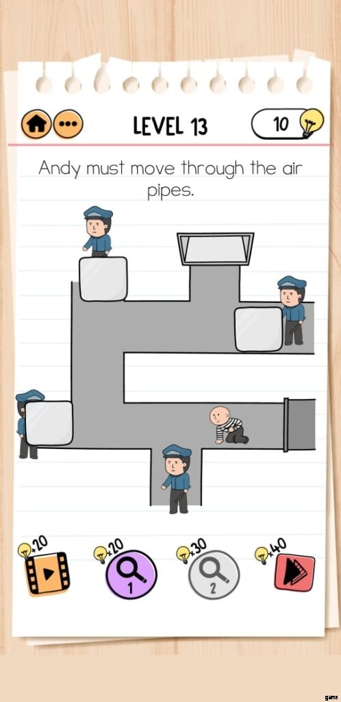 今、アンディは空気管の中にいて、その中を移動するにはあなたの助けが必要です。このゲームには、警察官をかわしてアンディを捕まえるために配置できる 3 つの異なるハードルがあります。問題があります。このゲームには 3 つのハードルしかありませんが、警察官が 4 人いるため、Brain Test 2 Prison Escape Level 13 は少しトリッキーです。