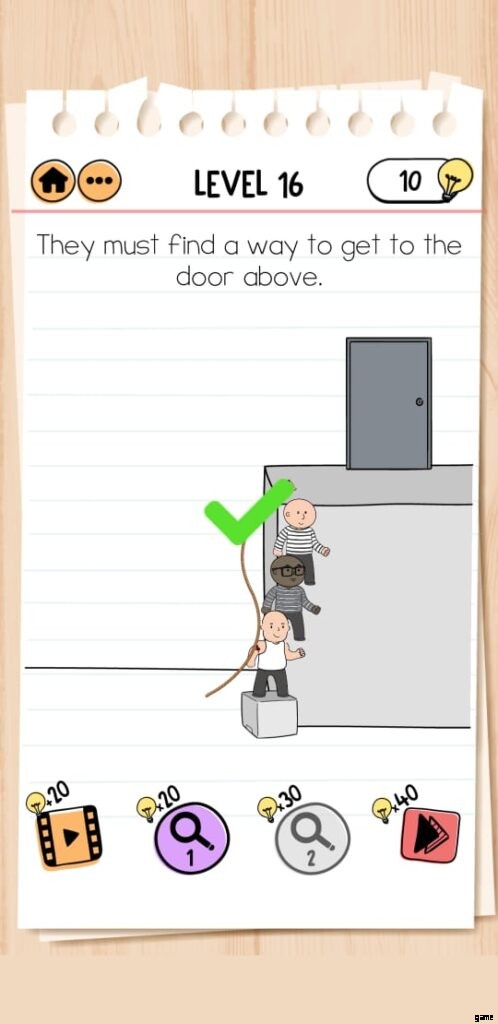 解決策 :長い壁の近くにレンガを置き、すべてのキャラクターを互いに近づけます。ロープをたたけば完成です。