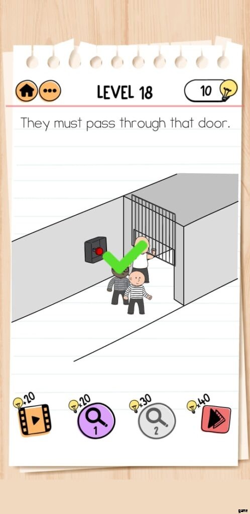 Brain Test 2 Prison Escape Level 18 には、攻撃を受けるとドアがしばらく開くボタンがあります。ドアを開けたままにするための解決策を見つけることが必須です。