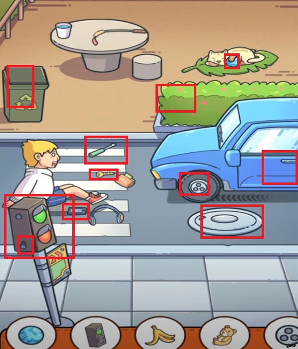 レベル 9 が始まると、自分が道に立っていることに気づきます。つまり、時間のプレッシャーや控除システムなしで、10 個の隠されたオブジェクトを見つけなければならないということです。このゲームにはタイマーがなく、画面をランダムにタップしてもポイントが差し引かれません。画面をクリックすると、いくつかのアイテムを見つけるのに役立つ場合がありますが、最終結果を得るために相互にやり取りする必要がある人のために何をすべきか.レベル 9 では、少年が道を渡るのを手伝わなければなりません。その間、隠されたオブジェクトを見つけることも必須です。ゲームでは、バナナ、テディベア、ボール、スピーカーなどのオブジェクトを見つける必要があります。