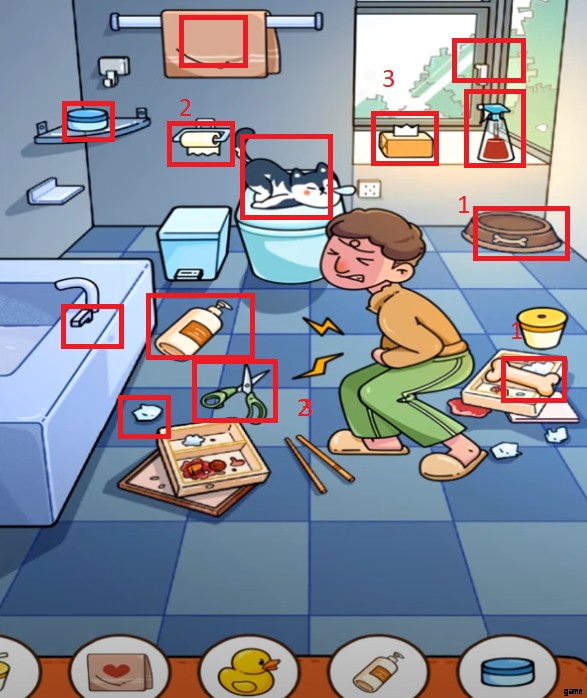おっと!おしっこ圧力で急いでいる男の子。少年の不安の理由は、子犬が便座の上で寝ているからです。猫を邪魔する必要はありません。現時点では、必要に応じて、コレクション アイテムのために猫を起こすための邪魔をする必要があるかどうかを確認します。ここまでで、隠されたオブジェクトを探し始めて、以下のリストを完成させてください。