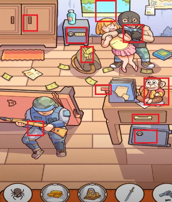- 後ろのポケットを探す 収集する警備員の おもちゃの鍵。 鍵を渡す 強盗がサルに音を立てさせます。 音で傷がつく おもちゃが作成します。強盗がおびえると、警備員が 彼が銃を落とせるように発砲します。