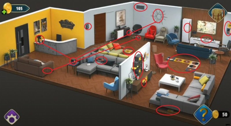 - シルバーのソファをクリック 部屋の一番下にある別の布をクリックして、緑の近くにある布を集めることを忘れないでください ソファ .