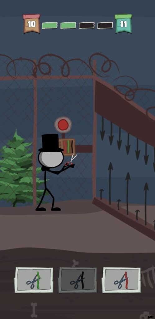 Your character was almost below the clock tower; therefore, Lupin needs to behave like a dog to keep himself saved for a while. The third round is a bit challenging because it features a door with moving spikes. Here your goal is to cut the right wire to stop the door from moving.