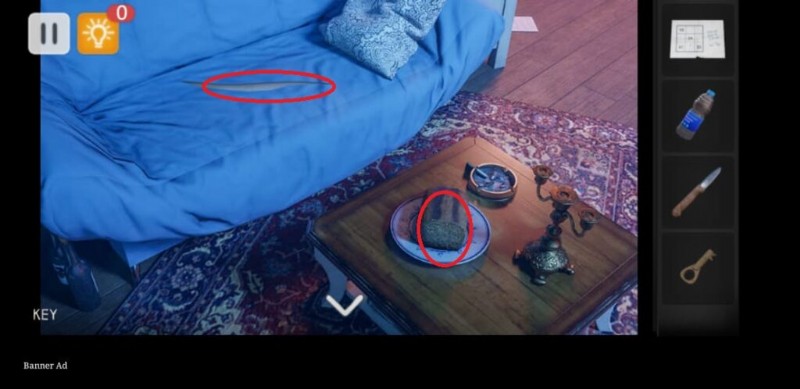 - 青いソファをクリックして、プレートの上から布を取り除きます。インベントリからナイフを選択し、焼きたてのパンを切って切れ目を集め、ソファを切って鍵を集めます。