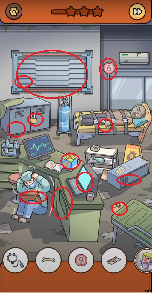 ありがたいことに、ゾンビは患者のベッドにしっかりと縛られており、時間のプレッシャーはありません。上記のアイテムを見つけるのに必要なだけ時間をかけてください。