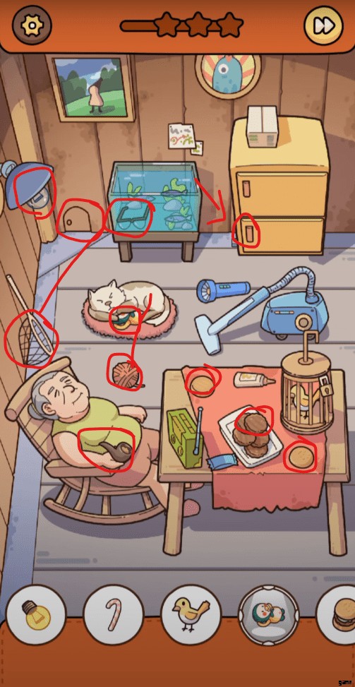 Find Out の 15 のレベルは、おばあちゃんがリラックスできる椅子で昼寝をしている部屋で行われます。この周りにはたくさんのアイテムがあり、最終的な目標は、画面の下部に表示されるアイテムを見つけてパズルを解くことです。このレベルを完了するまで、次のレベルにジャンプすることはできません。したがって、探偵のスキルを使って隠しオブジェクトのスキルを習得し、すべてのレベルを解決してください。