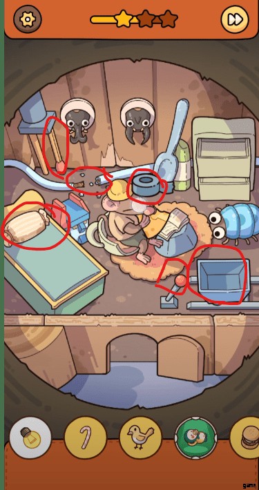 - もう一度マウス ホールにアクセスし、次の手順に従います。引き出しを開きます。 損傷したワイヤーを接続するテープを取り出します 隠しオブジェクトのリストを完成させるために必要な部屋の電球を点灯させます。