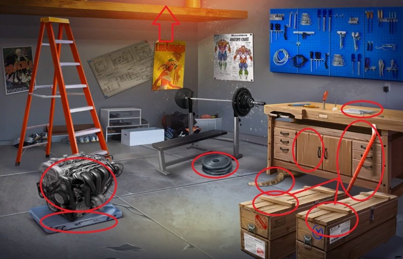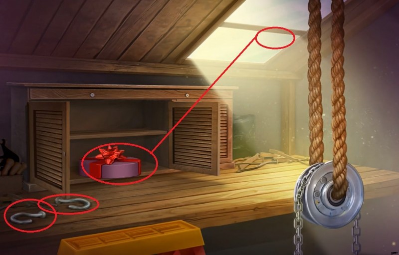- では、屋根をタップしてください 回転する車輪を見つけて接続する それとチェーン。セット エリアを離れる前に、キャビネットを開いてギフト ボックスを見つけることを忘れないでください。ミニゲームに取り組む前に、近くにあるフックを集めることをお勧めします。