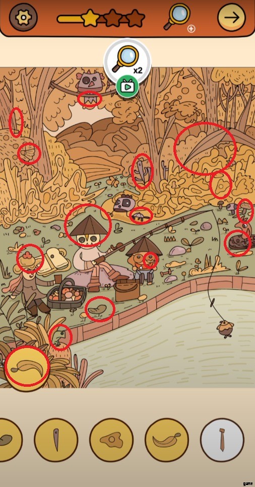 川の近くで、家族が一緒に魚を捕りながら過ごしています。背景には、木々や茂みでいっぱいのジャングルが見えるかもしれません。レベル 2 と同様に、Find Out Level 3 のカラー テクスチャはほぼ同じですが、今回のゲームでは黄色が使用されます。シーンを調査して、14 個の隠しオブジェクトを見つけてください。