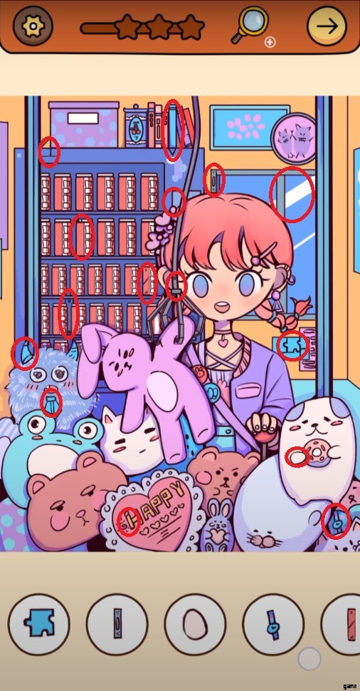 Lots of cute teddy bears and other toys have almost covered your screen, but they are cute. A girl is standing outside the machine trying to win a toy. Your ultimate goal is to find 16 hidden objects without any time pressure and penalty. Tapping the screen randomly may not help you; therefore, you should be master finding hidden objects.