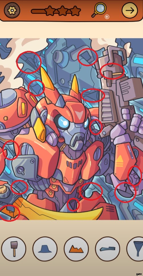 Surely, you would be one of those players who love those machines that turn into vehicles. The Level 11 of Find Out is revolving around such a type of machine that is now a robot holding a gun. To unlock Find Out Level 12 , you have to find 13 Hidden Objects.