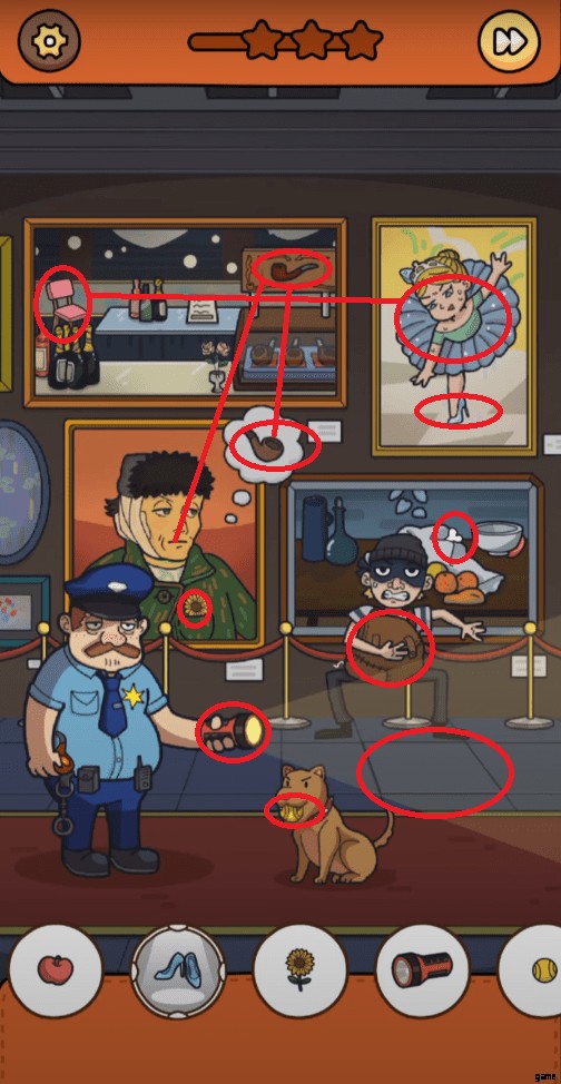 Find Out レベル 24 は、多くの絵画を調査できるアート ギャラリーで行われます。ゲームは、レベルを完了するために隠されたオブジェクトを見つけることをあなたに課します。これをクリアしないと次のレベルにジャンプできません。したがって、3 つ星でレベルを完了し、ゲーム内コインをたくさん獲得する必要があります。レベルが始まると、警備員がギャラリーの世話をしている間、犬がボールをくわえているのを見ることができます。 Find Out レベル 24 チュートリアルはこちら .
