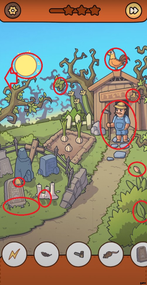 Find Out レベル 22 が始まると、あなたは荒廃した庭に立っていることに気づきます。あなたの最終的な目標は、農家がゾンビとの戦いに勝つのを助けることです。農夫は自分の土地でにんにくを栽培しており、現在誰かの助けを求めています。前のレベルと同様に、目標は 10 個以上の隠されたオブジェクトを見つけて、ゲームが画面の下部に提供するリストを完成させることです。