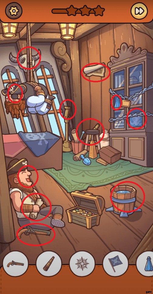 - ガラスの破片を使って海賊王のロープを切り、彼の口から歯を集めて、ゲームから割り当てられた隠しオブジェクトのリストを完成させましょう。